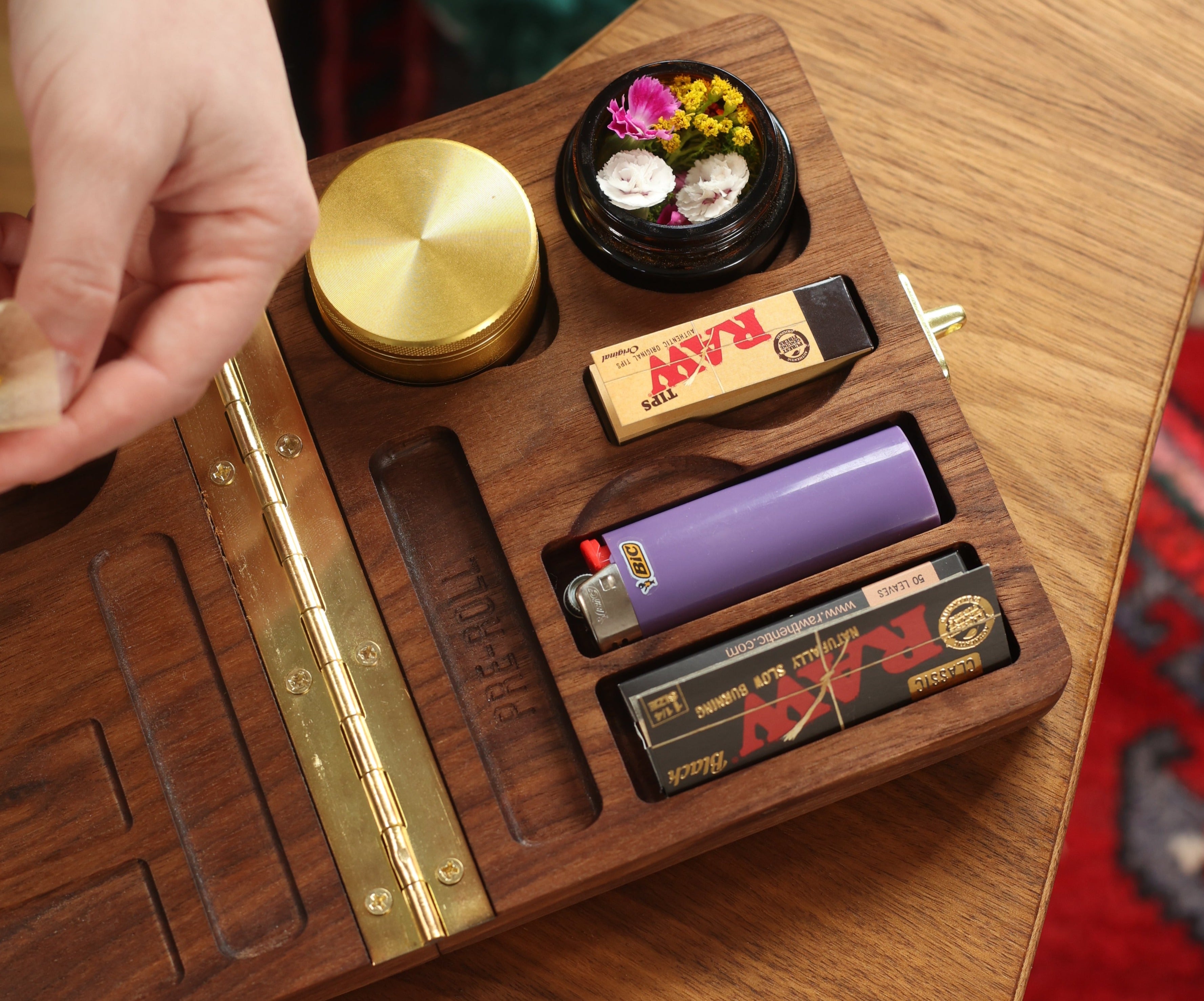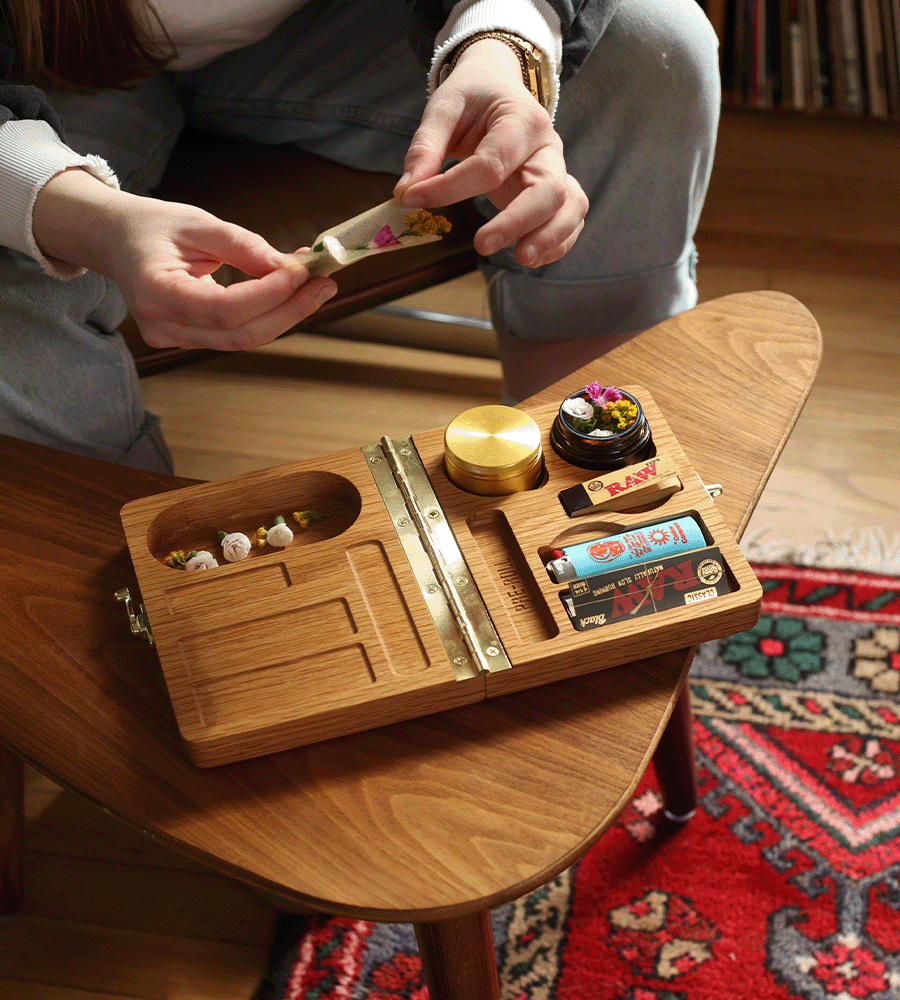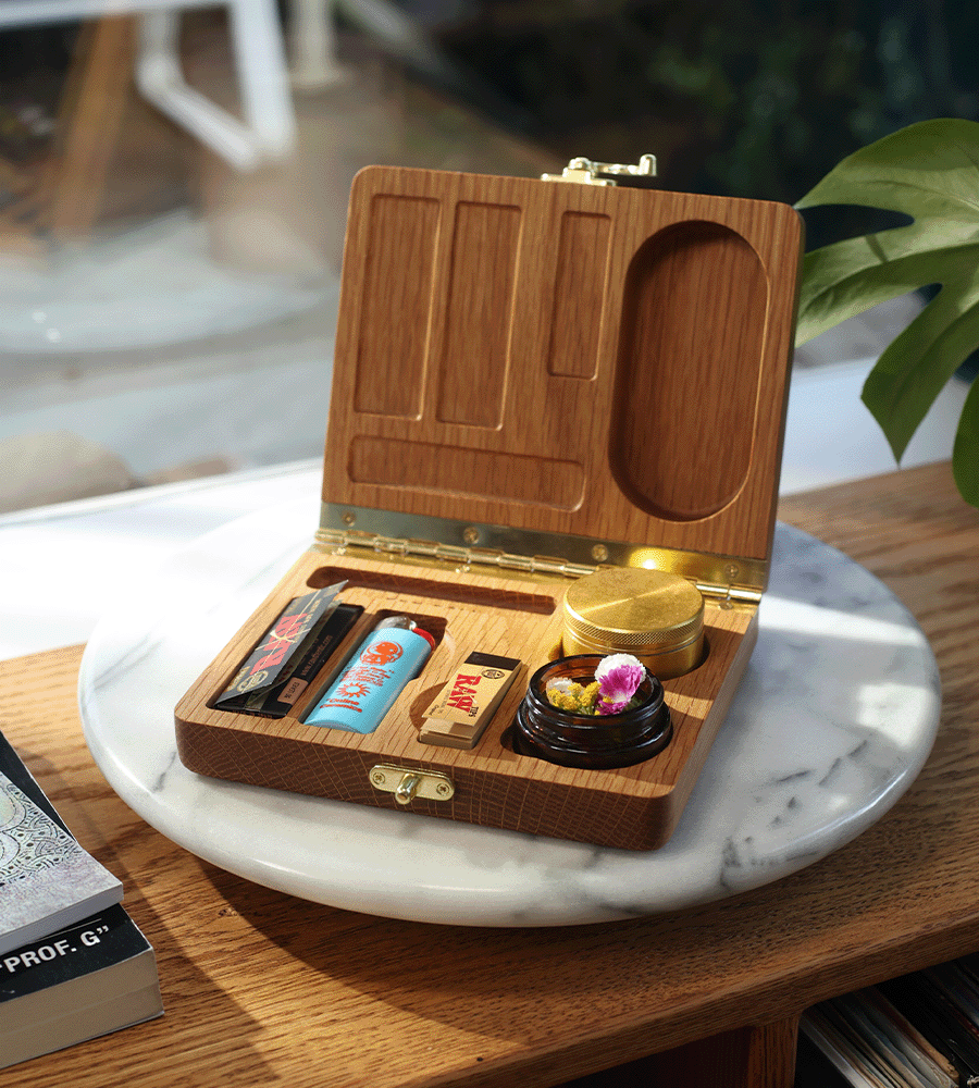 This hardwood clamshell box completely overhauls your messy rolling tray setup. Nestle your grinder (2” X 1.5”), air-tight jar (included with purchase), papers, filters, lighter, and two pre-rolls into thoughtfully engraved pocket compartments. We’ve even made a pocket to catch any fallout as you roll up. When you’re ready to store everything away or pack your Bud Box to-go, use the sophisticated bronze hardware closure to secure it all in place. Feeling creative? Add optional text engraving to customize the top of the box, making it the perfect gift for that special stoner in your life!