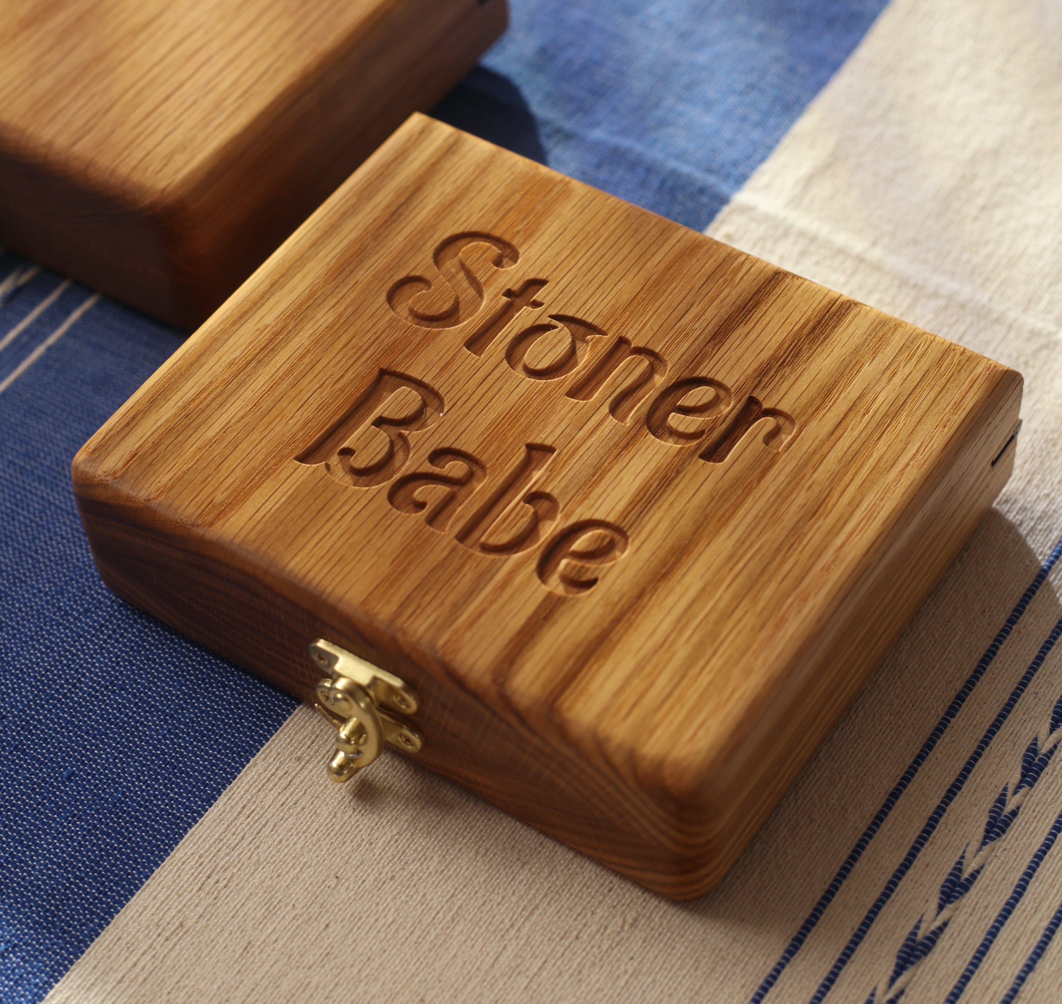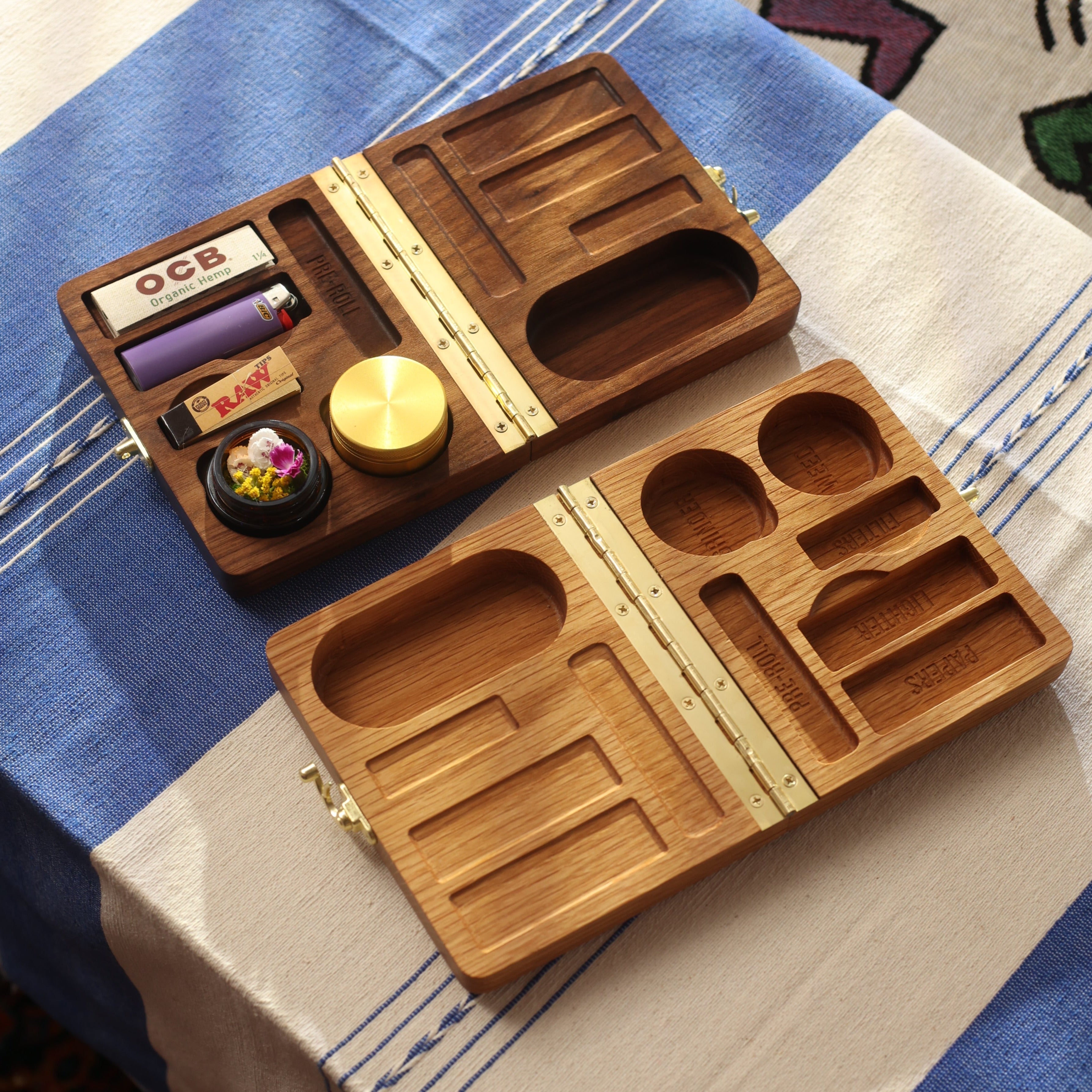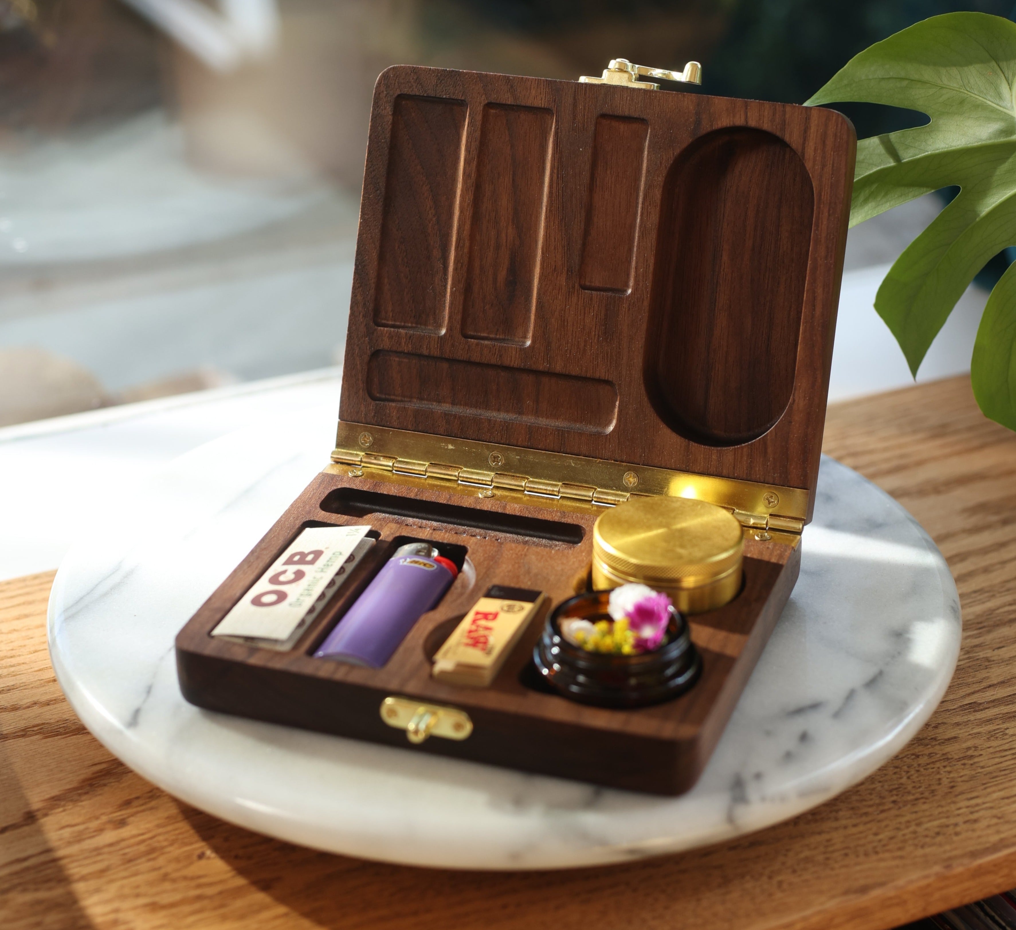 This hardwood clamshell box completely overhauls your messy rolling tray setup. Nestle your grinder (2” X 1.5”), air-tight jar (included with purchase), papers, filters, lighter, and two pre-rolls into thoughtfully engraved pocket compartments. We’ve even made a pocket to catch any fallout as you roll up. When you’re ready to store everything away or pack your Bud Box to-go, use the sophisticated bronze hardware closure to secure it all in place. Feeling creative? Add optional text engraving to customize the top of the box, making it the perfect gift for that special stoner in your life!