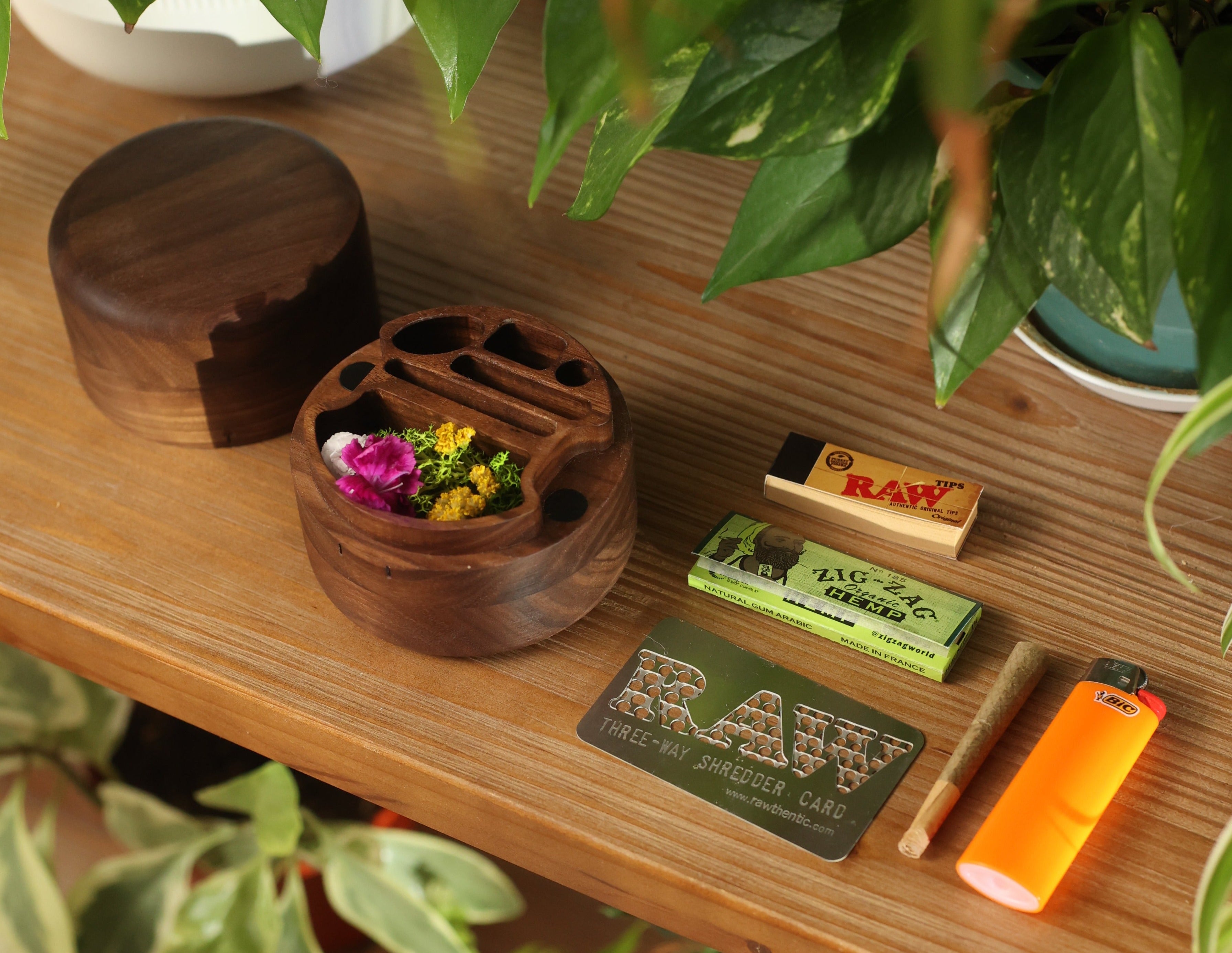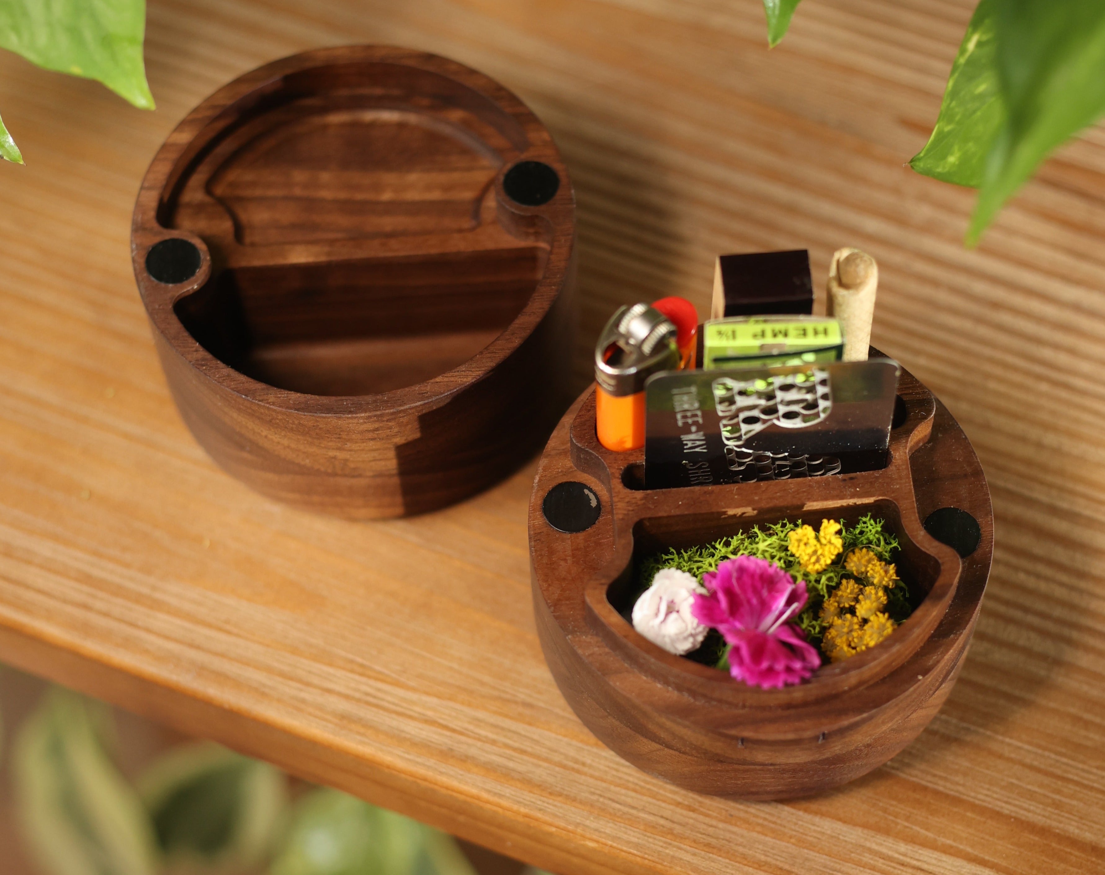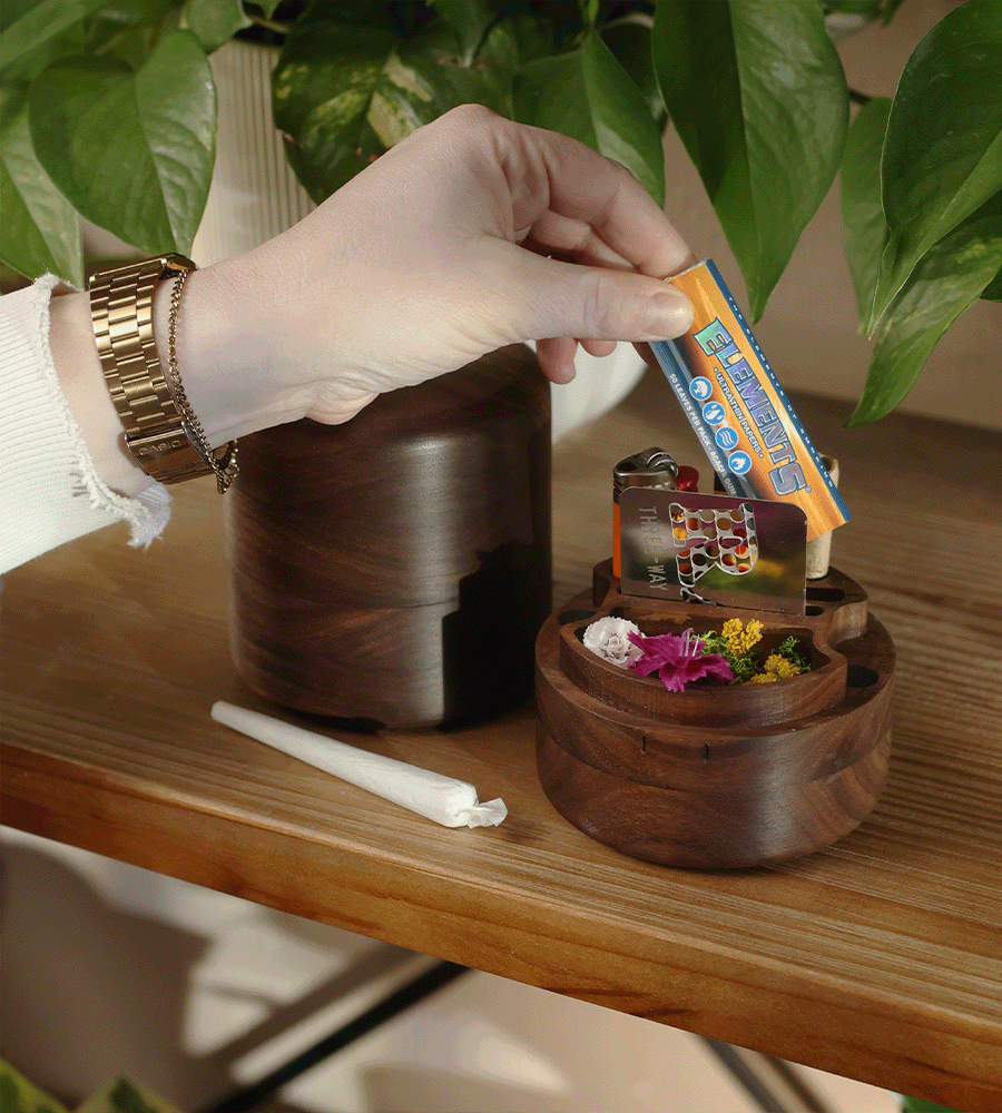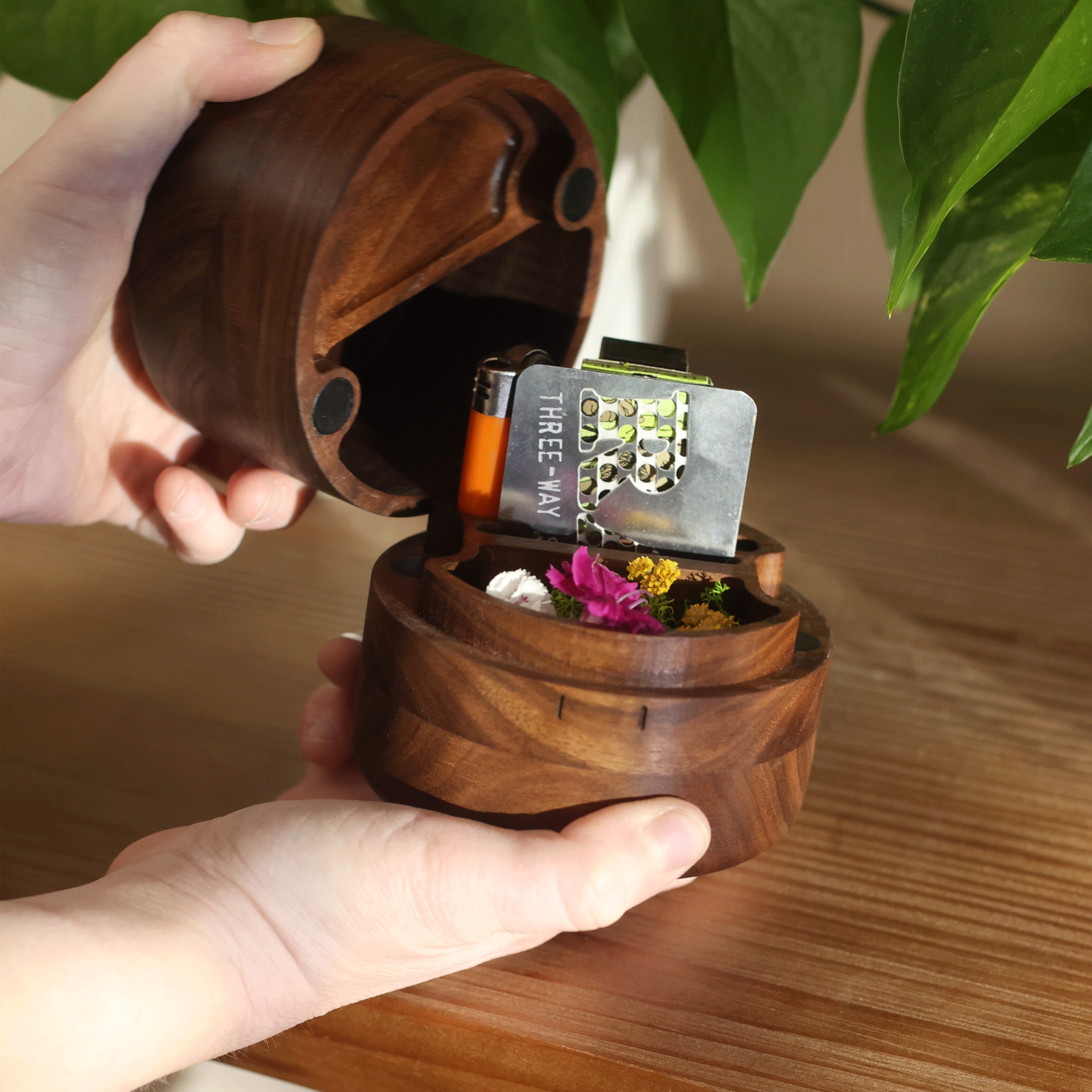 The Chill Capsule is a magical twist-to-open walnut case that holds a weekend supply of rolling essentials. Neatly hold your accessories in custom pockets outfitted for a grinder card, papers and filters, lighter, and a slot for a pre-roll. Plus, we’ve carved out a large storage compartment for your flower. The extra strong magnetic closures only open with a firm twist, keeping everything safe inside. Simply grab some fresh flower on the way out and you'll have everything you need for your weekend getaway.