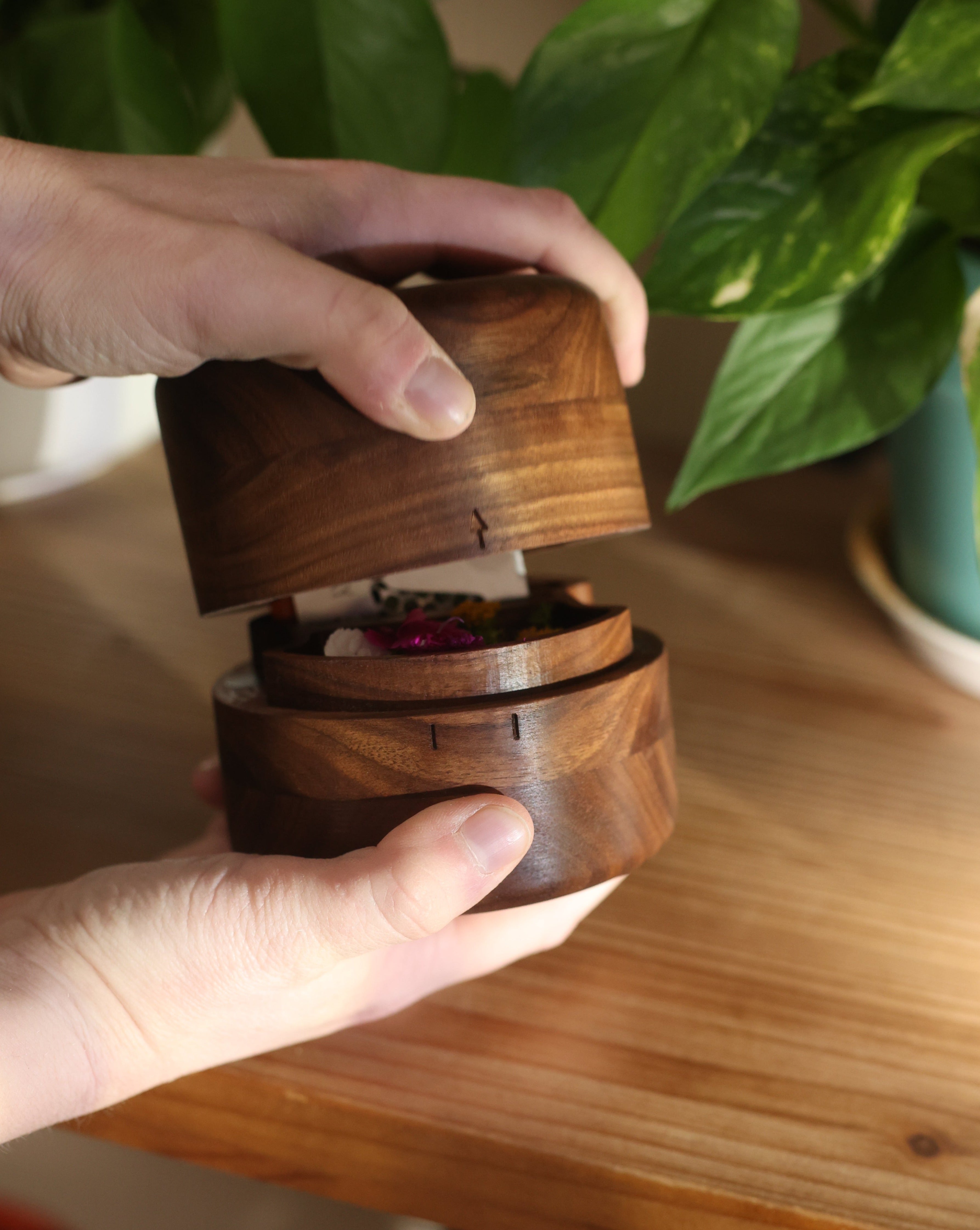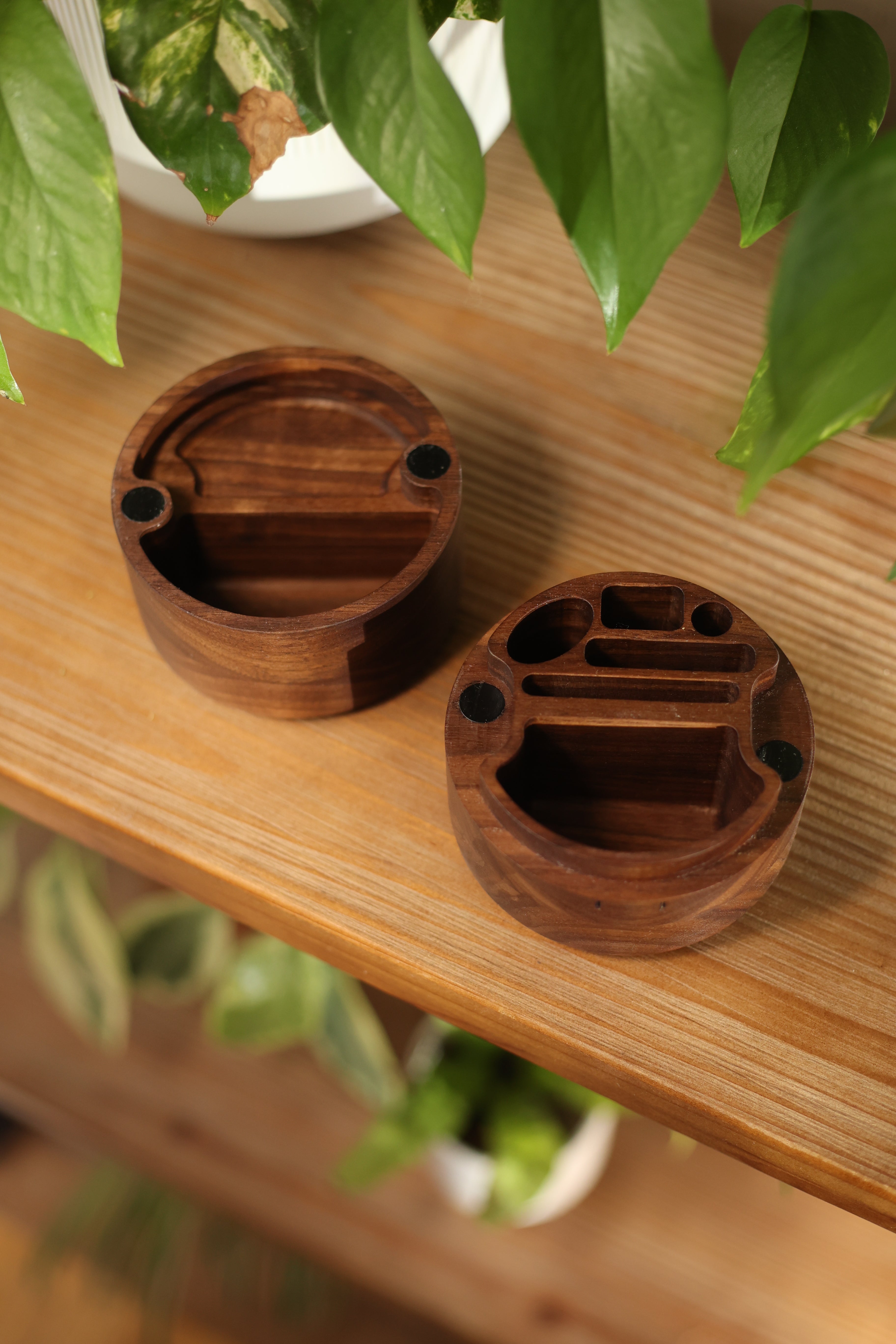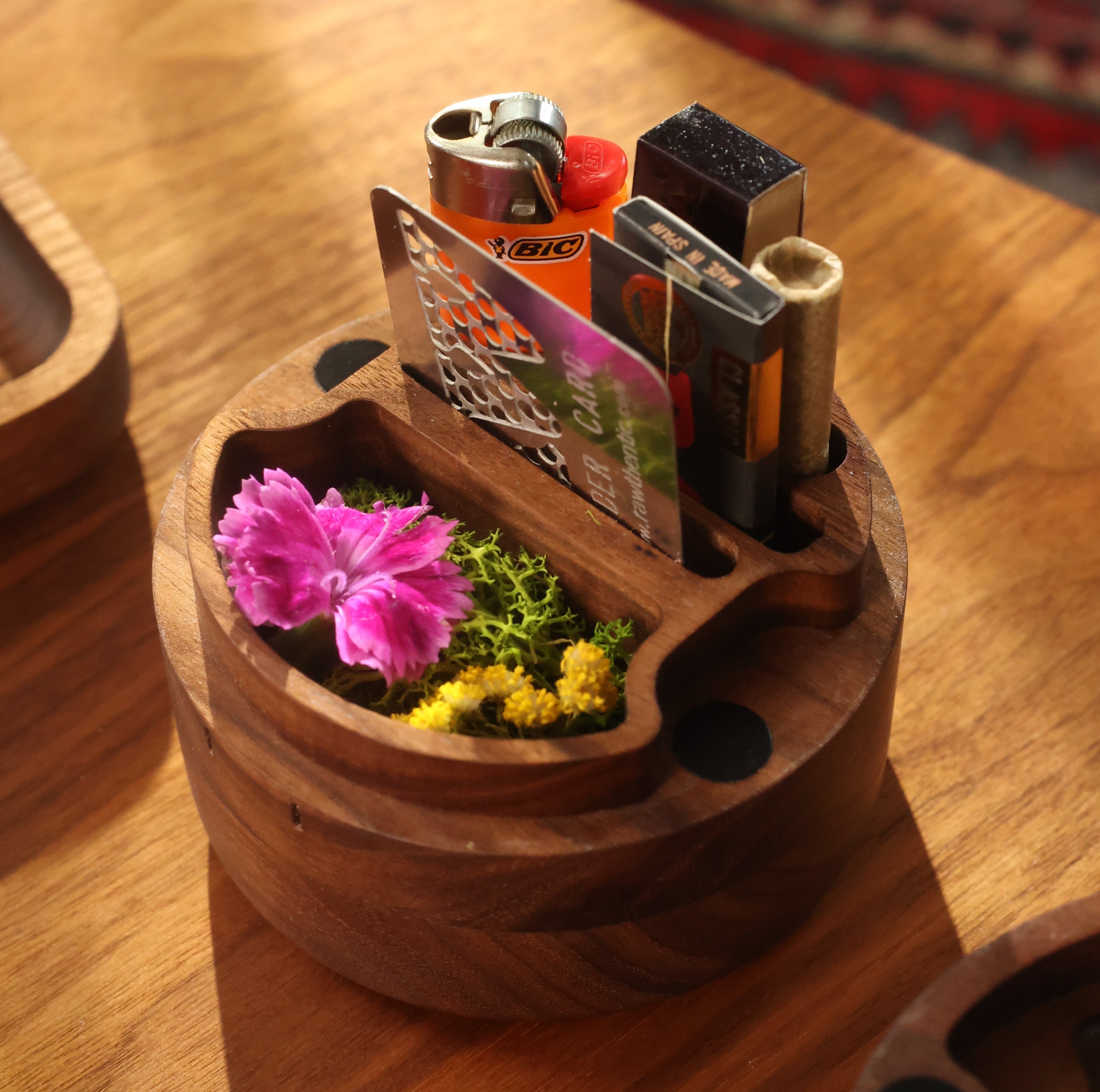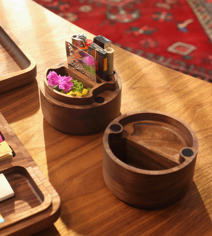 The Chill Capsule is a magical twist-to-open walnut case that holds a weekend supply of rolling essentials. Neatly hold your accessories in custom pockets outfitted for a grinder card, papers and filters, lighter, and a slot for a pre-roll. Plus, we’ve carved out a large storage compartment for your flower. The extra strong magnetic closures only open with a firm twist, keeping everything safe inside. Simply grab some fresh flower on the way out and you'll have everything you need for your weekend getaway.