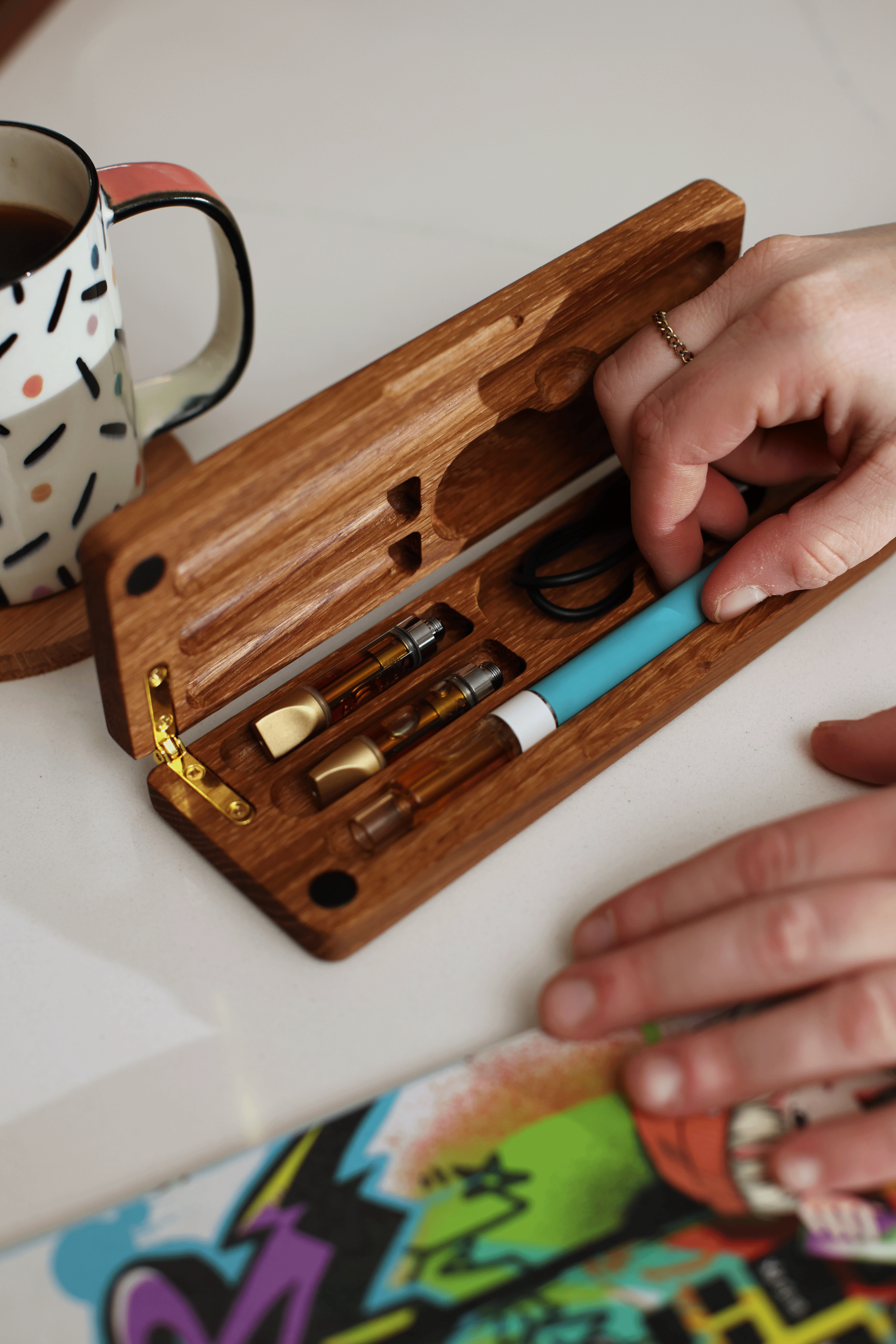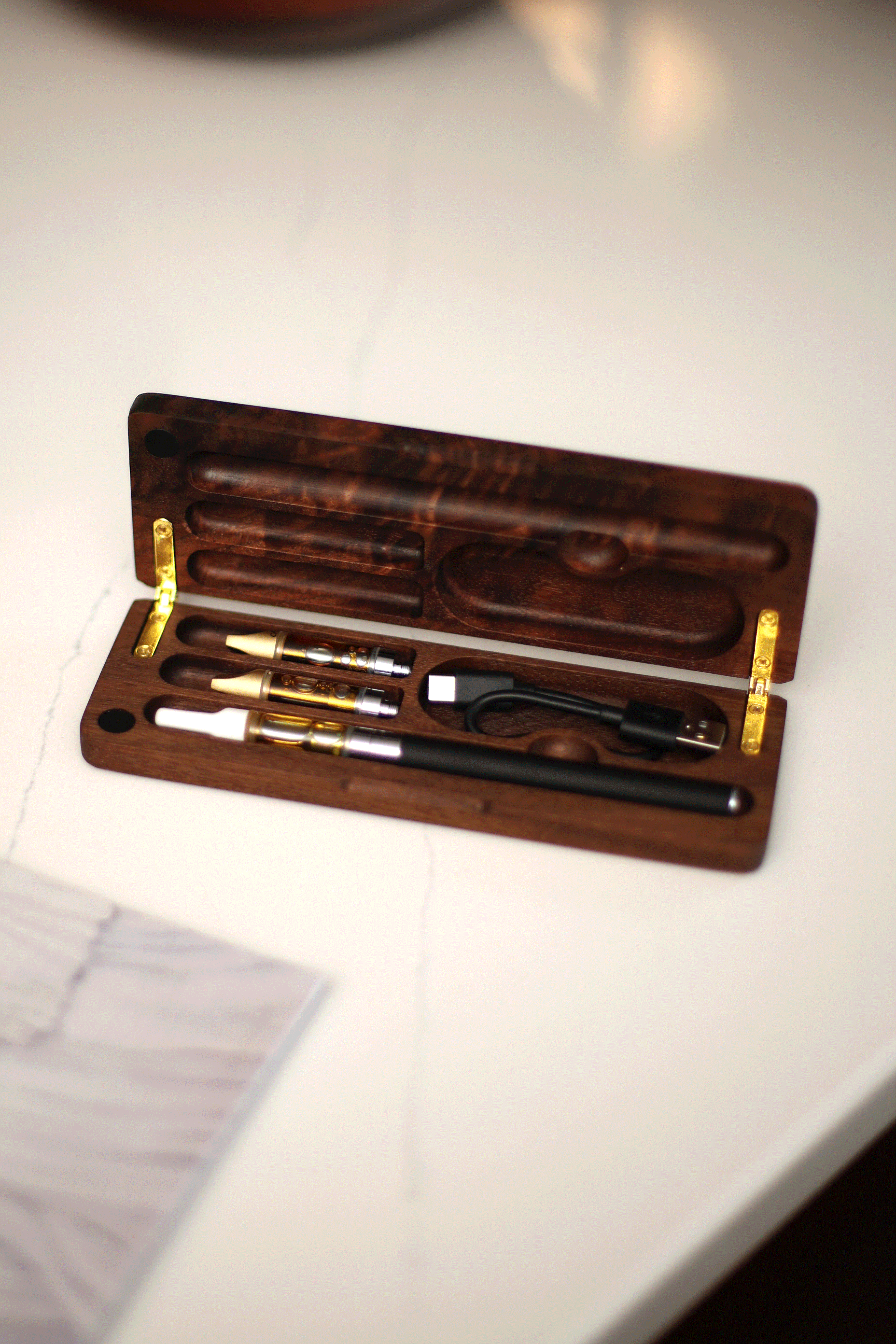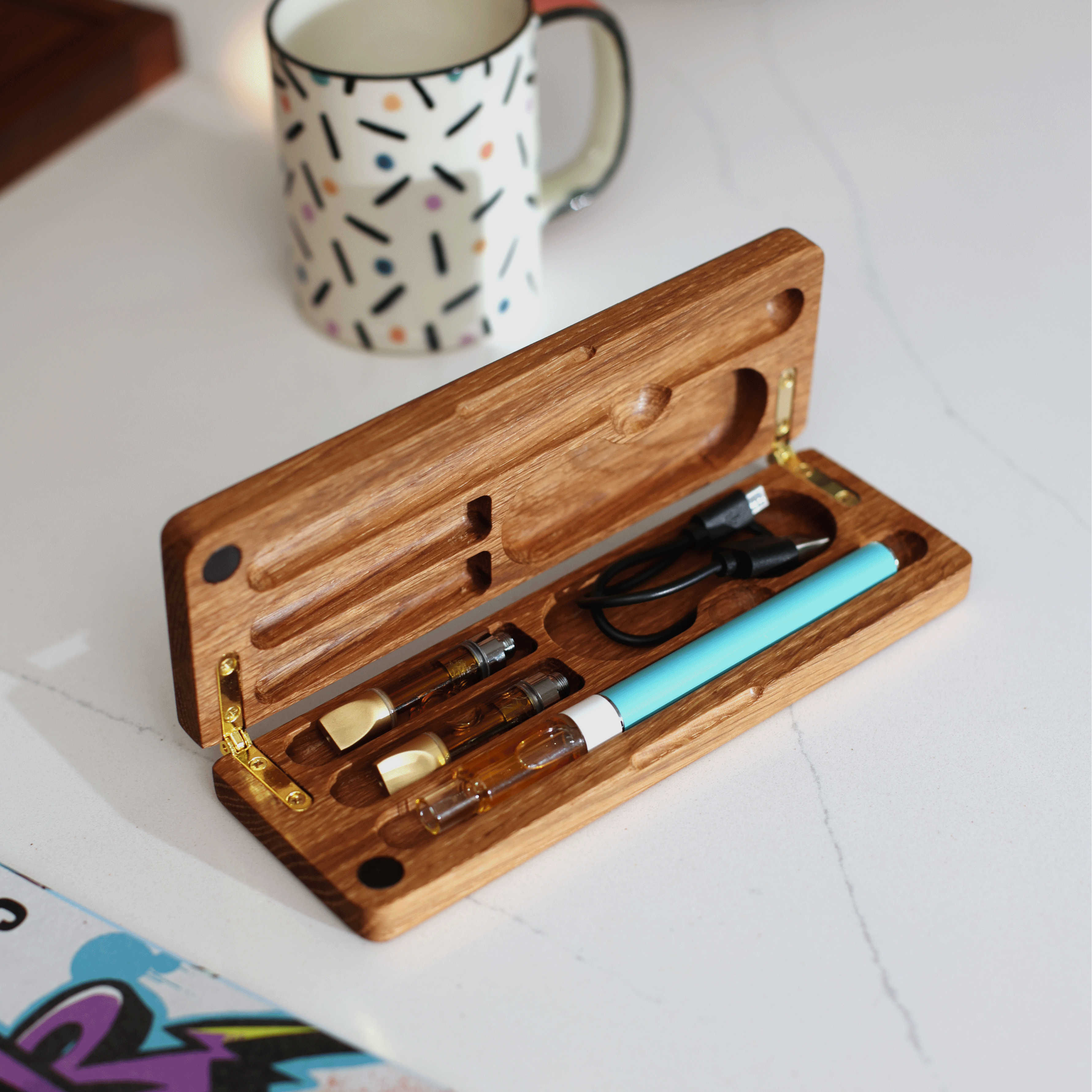 The Pen Pal is a compact hardwood case available in white oak or walnut hardwood. It features high quality brass hinges and a smooth durable finish. Inside you will find fitted spots for a vape pen two cartridges and a place for your charging cord so everything stays secure and protected.
