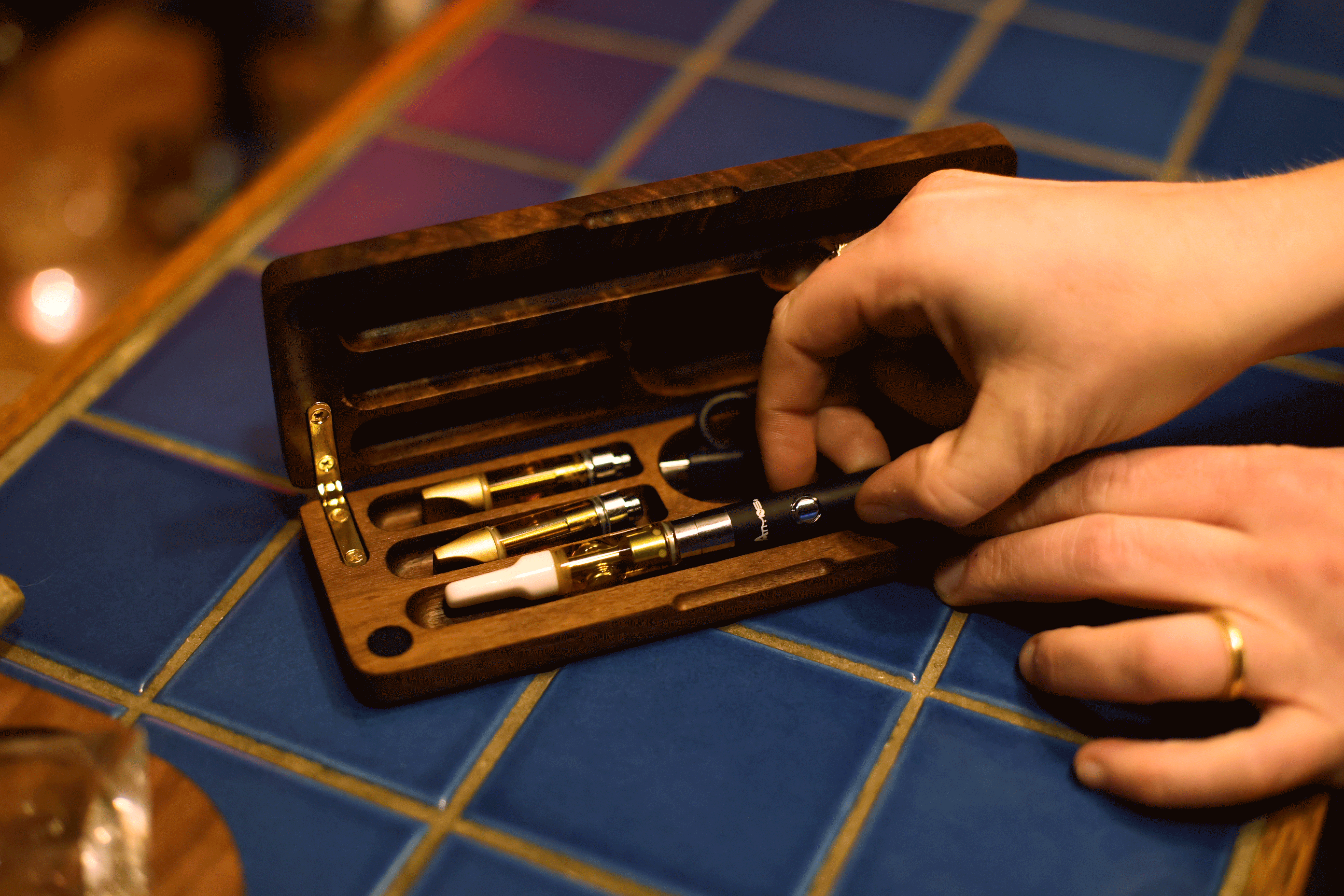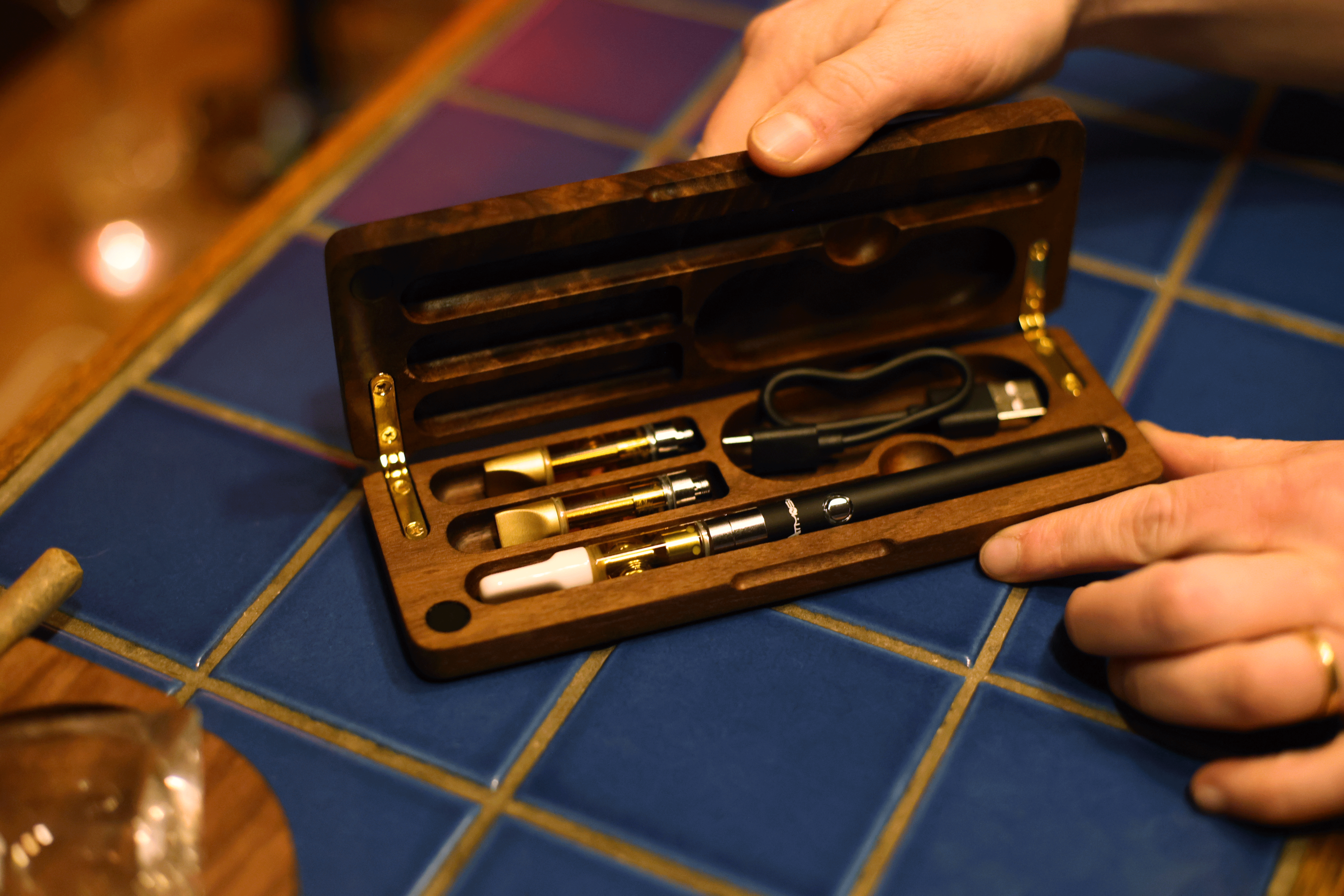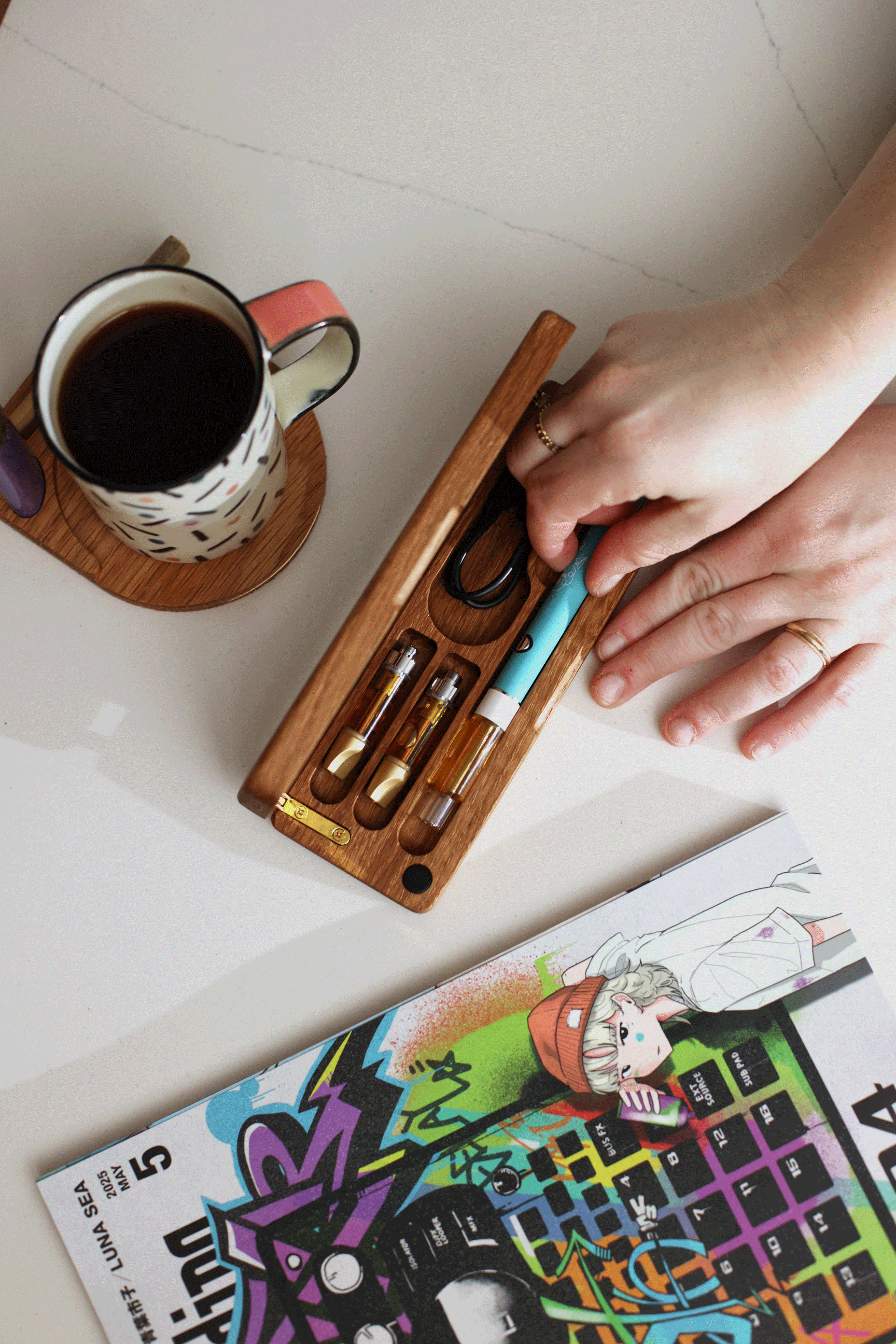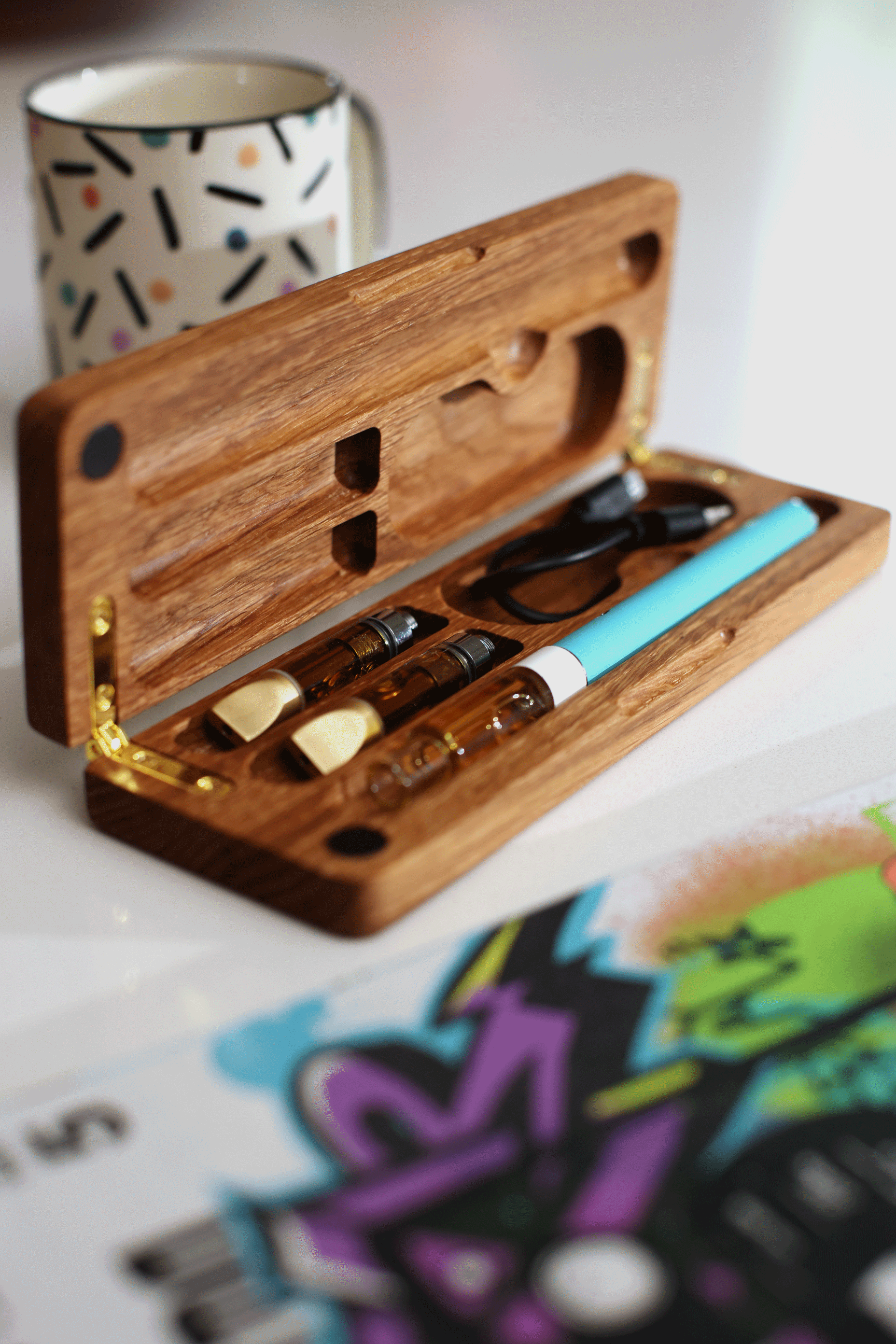 The Pen Pal is a compact hardwood case available in white oak or walnut hardwood. It features high quality brass hinges and a smooth durable finish. Inside you will find fitted spots for a vape pen two cartridges and a place for your charging cord so everything stays secure and protected.